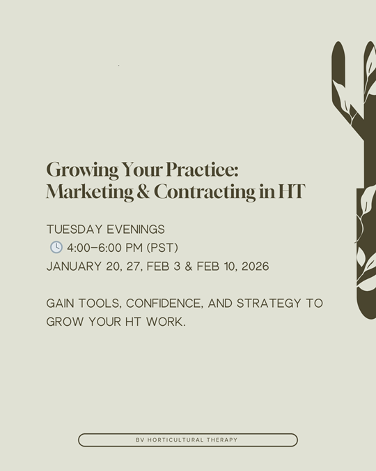 While we’re at it, horticultural therapy has so much to offer, and sharing that value is key. Pull from research, theory, and practice examples to clearly communicate why HT/TH works and why it matters.
