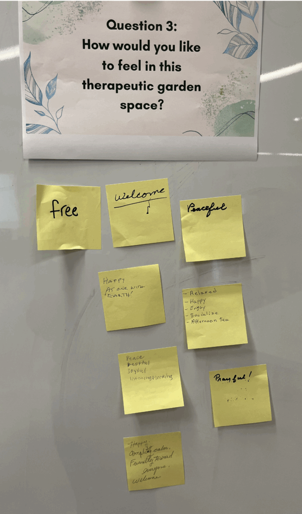 This research mirrors my own experience facilitating the community-led design process for the therapeutic garden design at Kiwanis Village in Nanaimo, BC. Rather than beginning with a predetermined design, we led with a 3 part series of participatory sessions to gather input directly from residents.